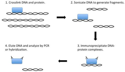 染色質免疫沉淀技術(Chromatin immunoprecipitation assay, ChIP)是研究體內環(huán)境下DNA與蛋白質互作的方法,常用于體內轉錄因子結合位點等方面的研究。其基本原理是在活細胞狀態(tài)下固定蛋白質-DNA復合物,并將其隨機切斷為一定長度范圍內的染色質小片段,然后通過免疫學方法沉淀此復合體,特異性地富集目的蛋白質結合的DNA片段,通過對目的片斷的純化與檢測,從而獲得蛋白質與DNA相互作用的信息。